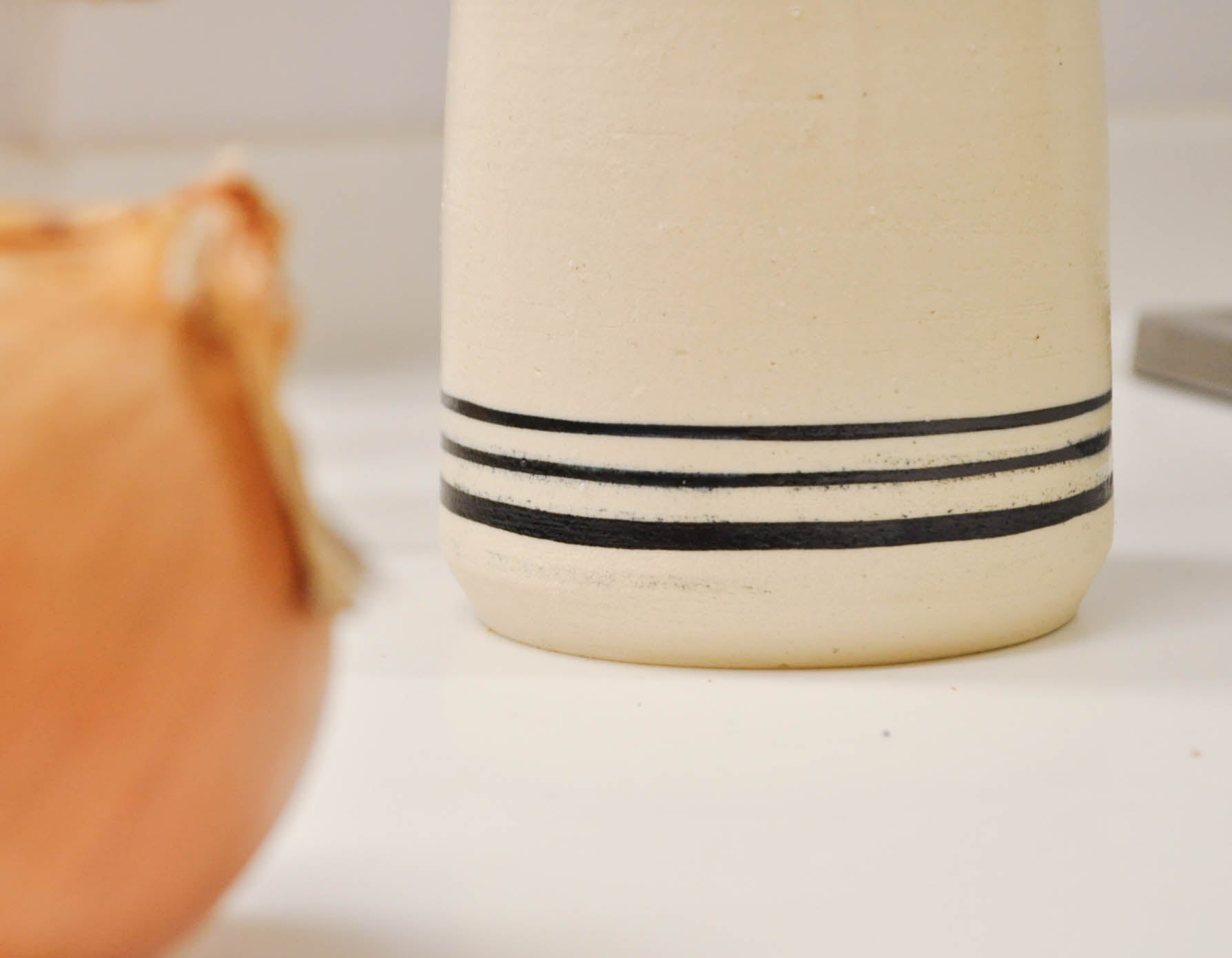 The design is inspired by ancient Mediterranean ceramics, which were often decorated with linear patterns. The mouth is not perfectly symmetrical, which gives the piece an aspect of authenticity.